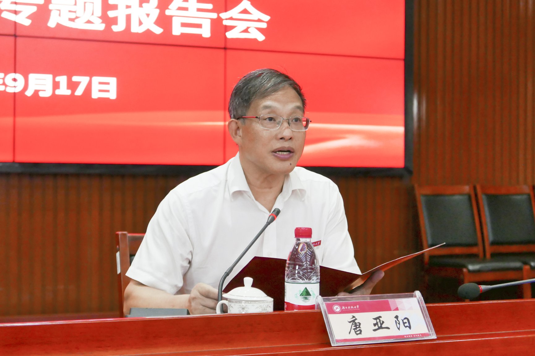 9月17日下午,“湘江高端学术论坛”暨校党委理论学习中心组(扩大)统战工作专题报告会在立德楼A附楼五楼报告厅举行。民盟中央专职副主席、全国人大宪法和法律委员会副主任、浙江大学教育学院博士生导师徐辉教授来校以“当前我国教育立法的最新趋势”为题作专题报告。校党委书记唐亚阳出席并主持会议,校党委副书记、校长朱川曲及其他在校的党委委员和校领导参加了会议,学校各民主党派、统战团体全体班子成员,民盟科大委员会盟员代表,相关职能部门主要负责人及教育学院师生代表近200余人与会。