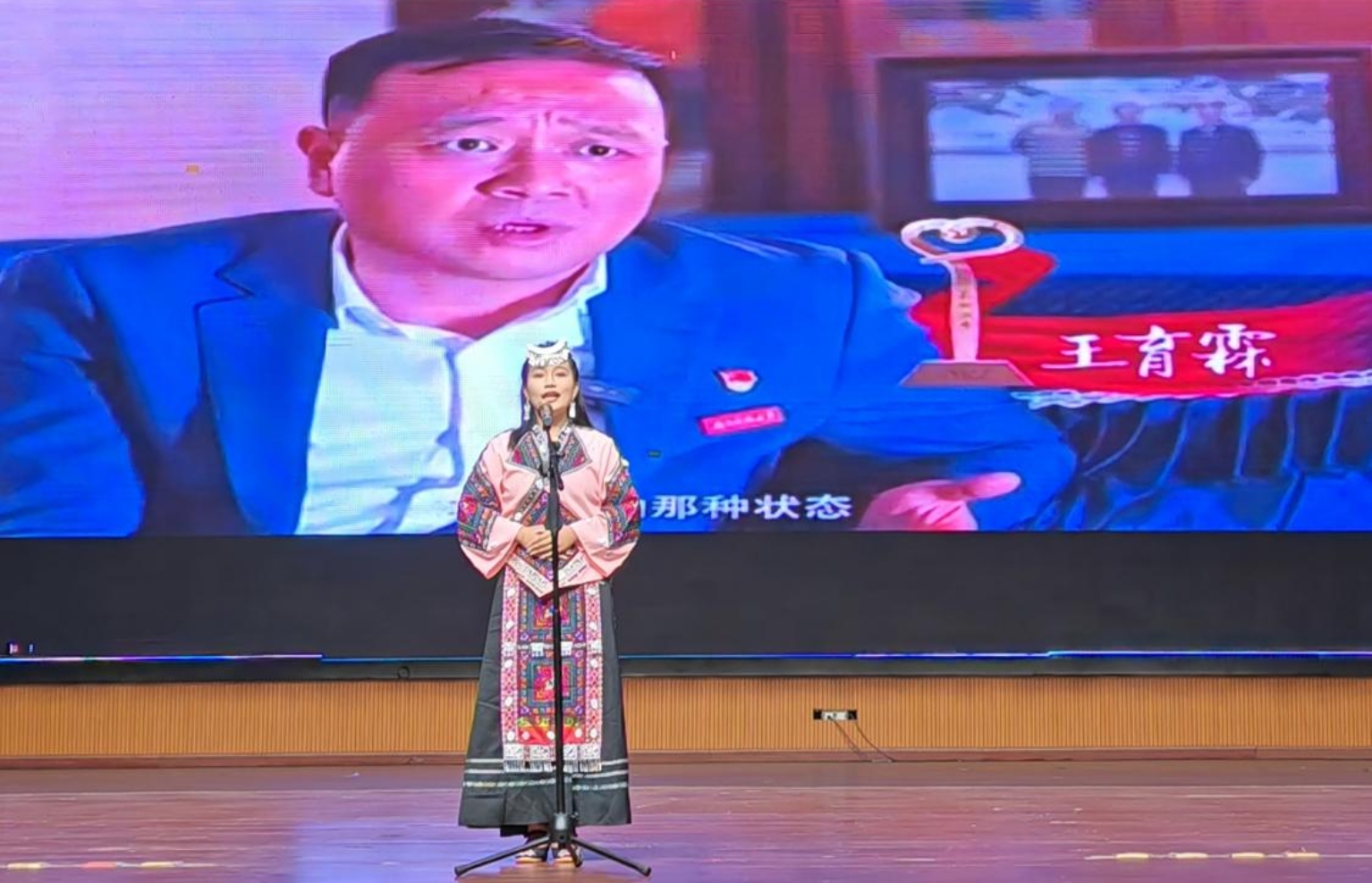 王思怡身着土家族服饰,以真挚的感情、鲜活的语言,以《疆来湘往,用音乐架起“文化润疆”桥》为题,生动的讲述了黎锦辉音乐学院副院长王育霖教授文化润疆的故事,故事深深感染了现场的每一位观众,充分展现了科大学子良好精神风貌。